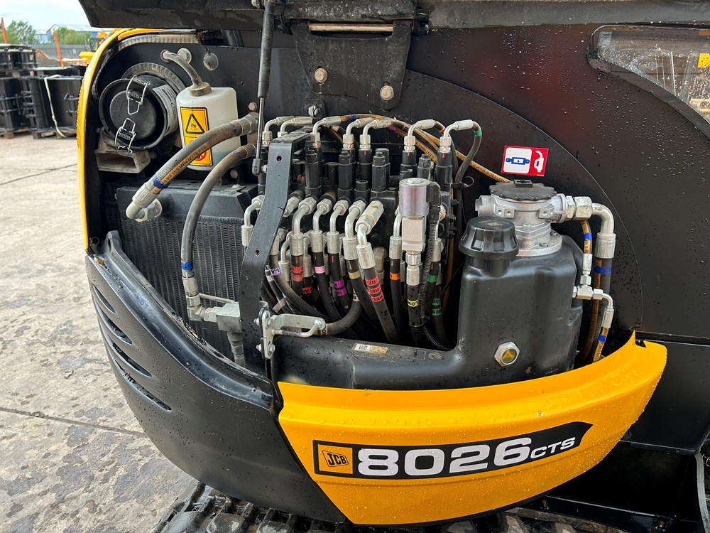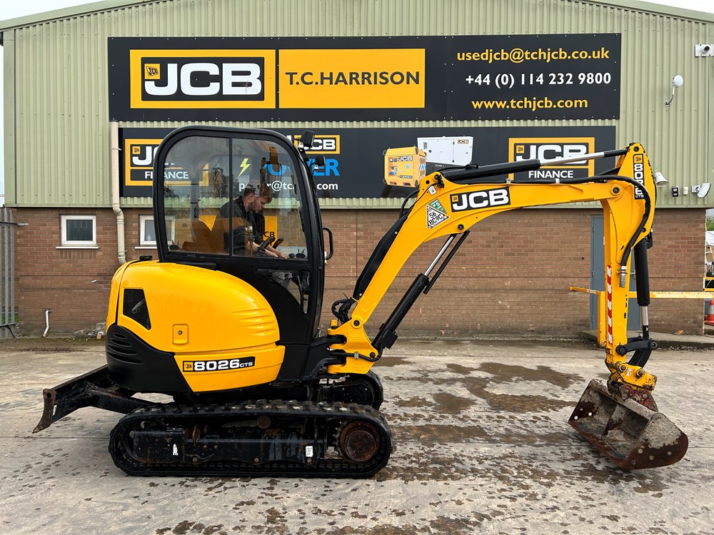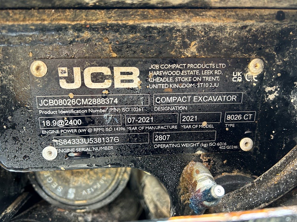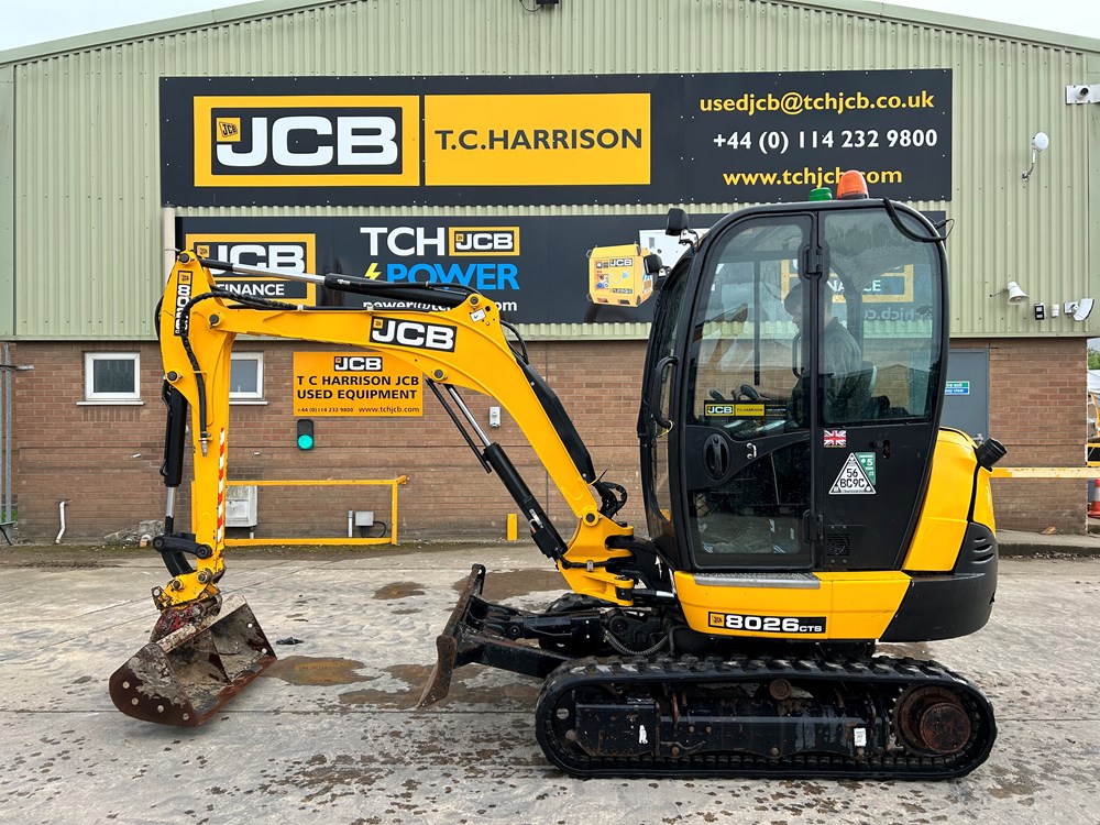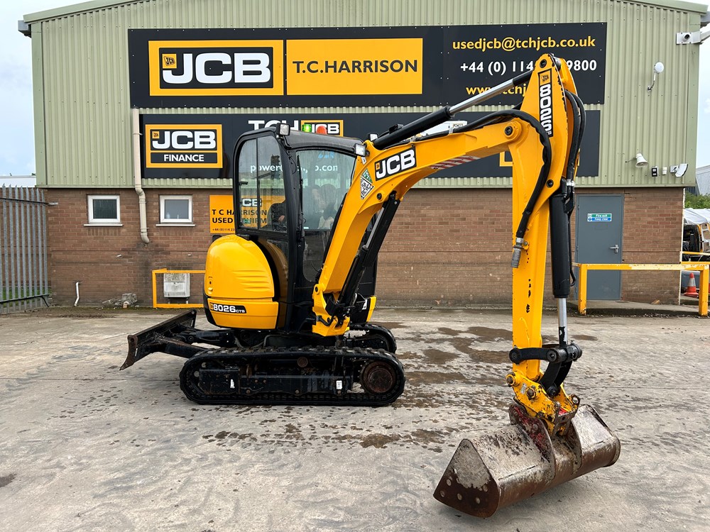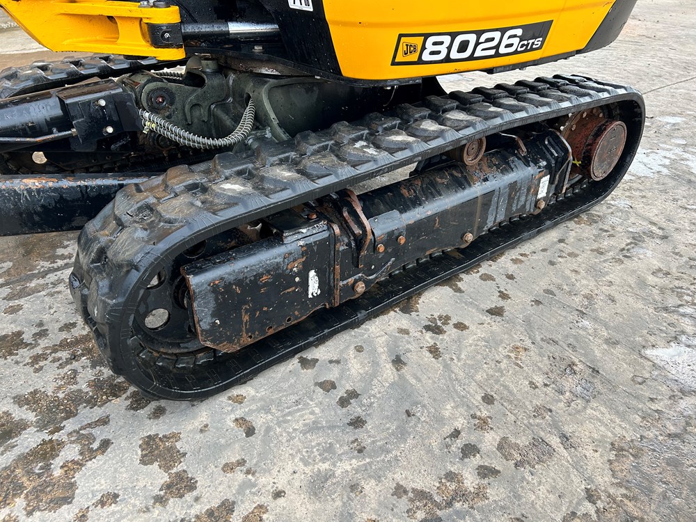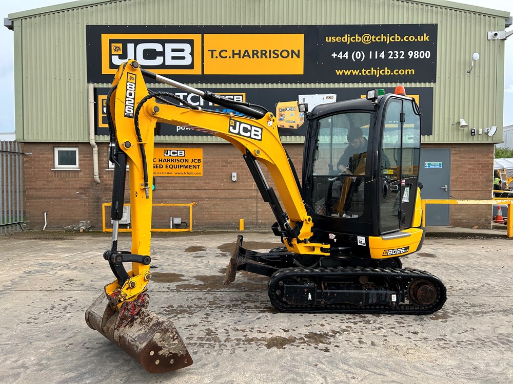 JCB 8026 MINI EXCAVATOR - CAB WITH HEATER, RUBBER TRACKS, ISO SERVO CONTROLS, ONE MECHANICAL PROPORTIONAL FOOT CONTROL AUXILIARY, FABRIC SUSPENSION SEAT, 51" (1300MM) DIPPER, STANDARD MAXI-LIFT LONG DOZER BLADE (OVERALL WIDTH 61" (1550MM), SINGLE/DOUBLE ACTING AUXILIARYCIRCUIT WITH CHANGE OVER VALVE, FRONT CAB WORK LIGHTS, LIGHT WEIGHT PACKAGE (40L FUEL TANK, REDUCED COUNTERWEIGHT & PLASTIC FLOOR MAT), MECHANICAL QUICK HITCH, 3 X USED BUCKETS - LOCATION: TCH JCB LINCOLN