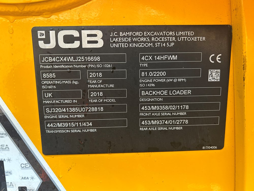 *** CONSIGNED TO TCH JCB AUCTION, START PRICE £47,000 - VISIT www.tchjcbauction.com NOW FOR MORE INFORMATION, TO REGISTER & BID, AUCTION ENDS TUESDAY 24TH JUNE 2025, NO BUYERS FEES, WHAT YOU BID IS WHAT YOU PAY, NO DEPOSIT REQUIRED, THE START PRICE IS THE RESERVE PRICE *** JCB 4CX BACKHOE LOADER - 14' EXTENDING DIPPER, POWERSLIDE, 81kW (109HP) T4F ENGINE, MANUAL CONTROLS, HEAVY LIFT, AUTOSHIFT + F&R LSD, AWS, CAB WITH AIR CONDITIONING, HEATED CLOTH AIR SUSPENSION SEAT WITH HEADREST, HAMMER/BI-DIRECTIONAL PIPEWORK, BOOM END DAMPENING, 5/8 LOADER PIPEWORK, RTD & AUTO SRS, REAR LAMP GUARDS, 180KG COUNTERWEIGHT, EXCAVATOR CONTROL PATTERN (ISO +), LED WORKLIGHTS, MECHANICAL QUICK COUPLER, NEW FRONT QUICK HITCH WITH INTEGRAL PALLET FORKS, NEW QUICK HITCH MOUNTED 6-IN-1 FRONT BUCKET - LOCATION: TCH JCB LINCOLN