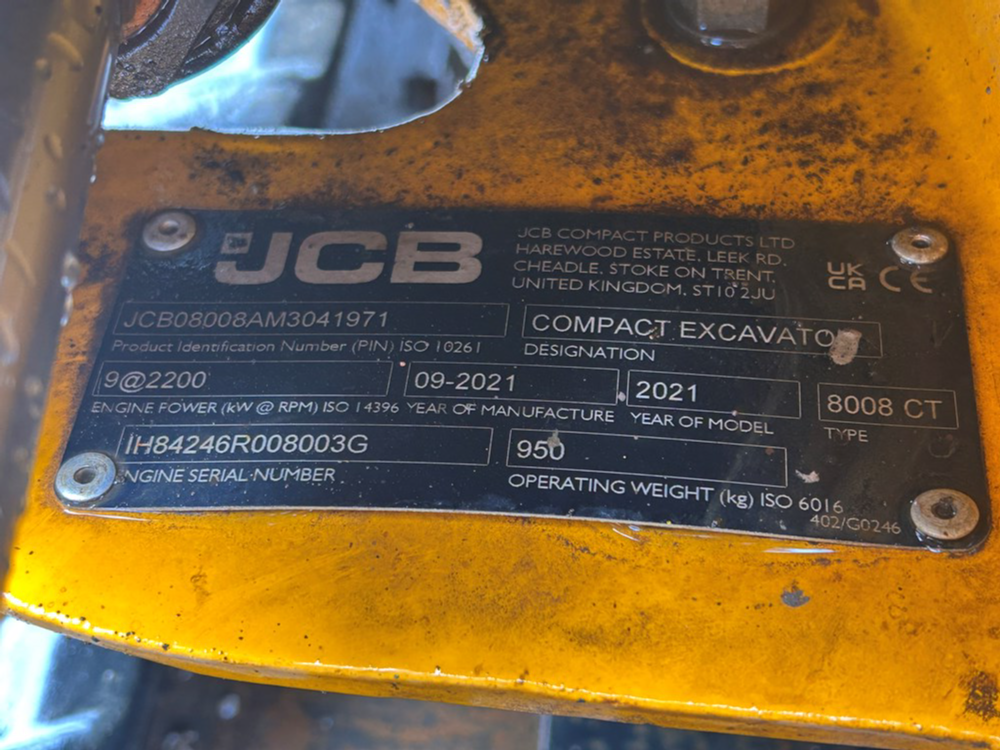 *** CONSIGNED TO TCH JCB AUCTION, START PRICE £6,000 - VISIT www.tchjcbauction.com NOW FOR MORE INFORMATION, TO REGISTER & BID, AUCTION ENDS MONDAY 24TH MARCH 2025, NO BUYERS FEES, WHAT YOU BID IS WHAT YOU PAY, NO DEPOSIT REQUIRED, THE START PRICE IS THE RESERVE PRICE *** JCB 8008 MICRO EXCAVATOR - FRONT MOUNTED TOPS FRAME, RUBBER TRACKS, ISO PATTERN CONTROLS, HIGH BACK SEAT, 887MM DIPPER, GREASE TENSIONER FOR TRACKS, SINGLE ACTING AUXILIARIES, BOOM WORKLIGHT, EXTENDING UNDERCARRIAGE, DOZER BLADE WITH EXTENSIONS, 2 X USED BUCKETS - LOCATION: TCH JCB LINCOLN