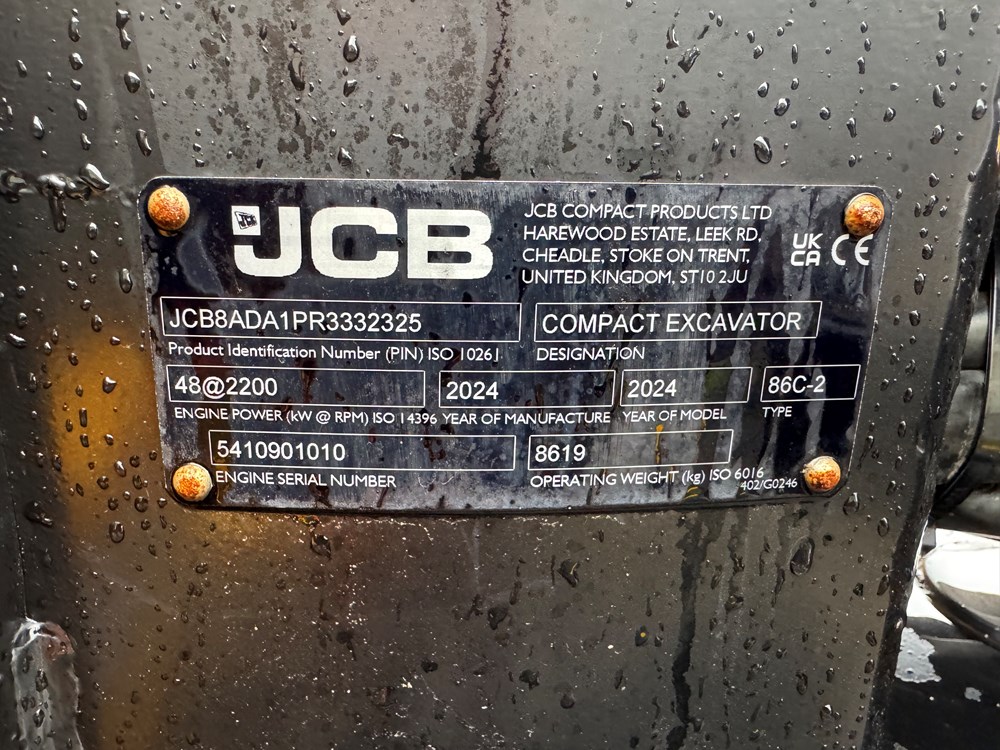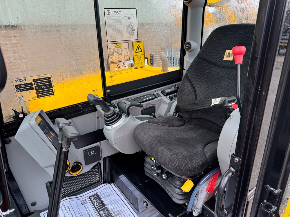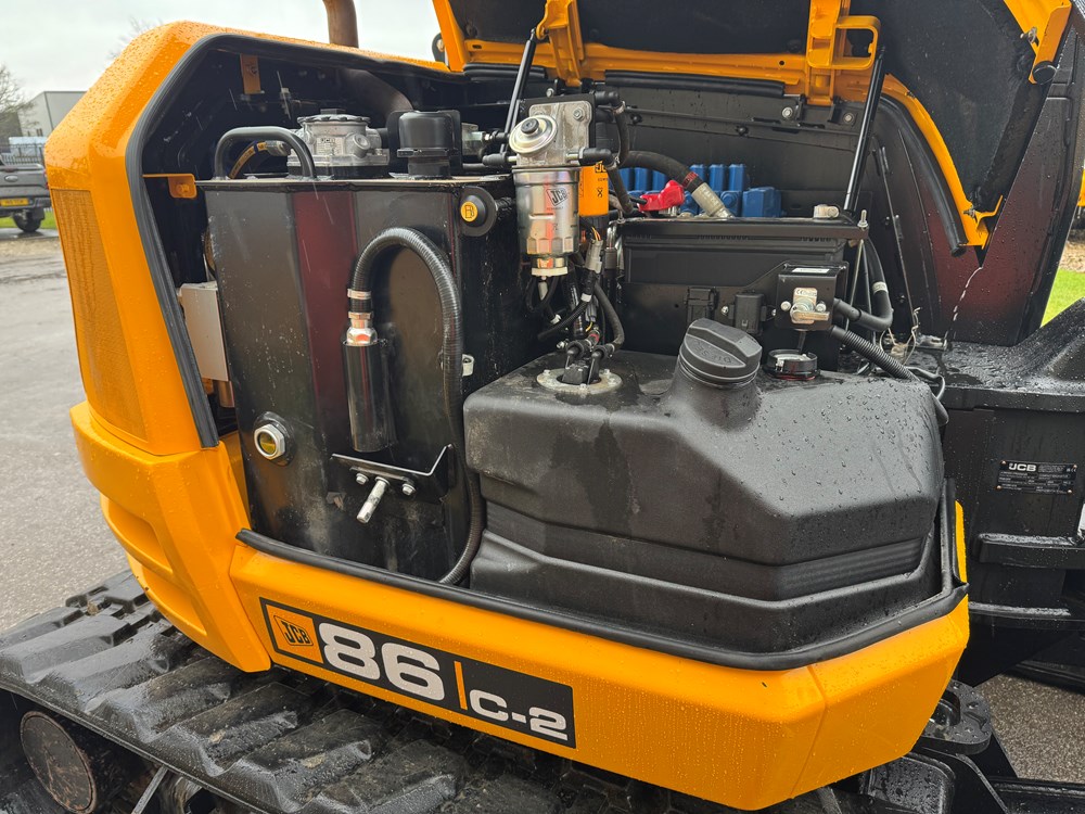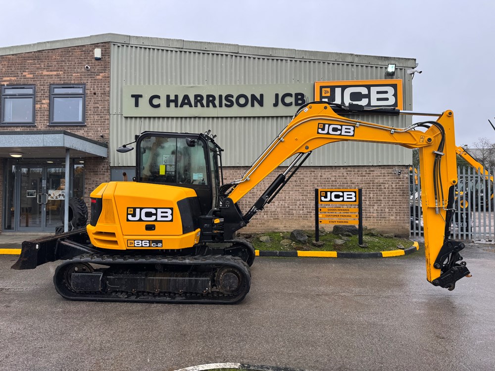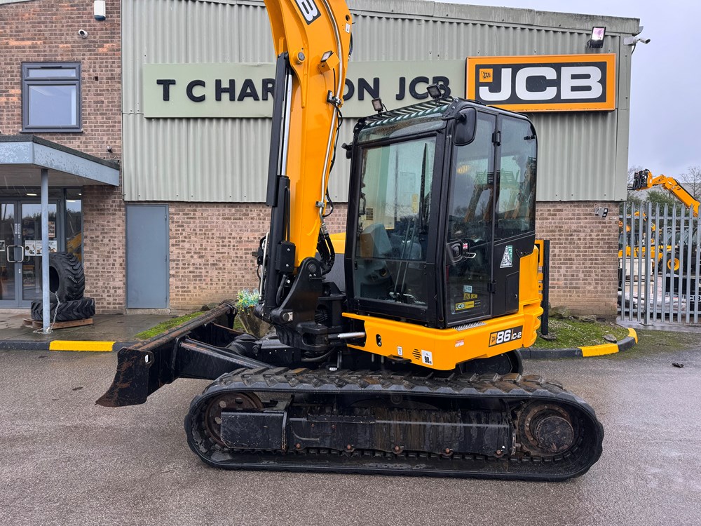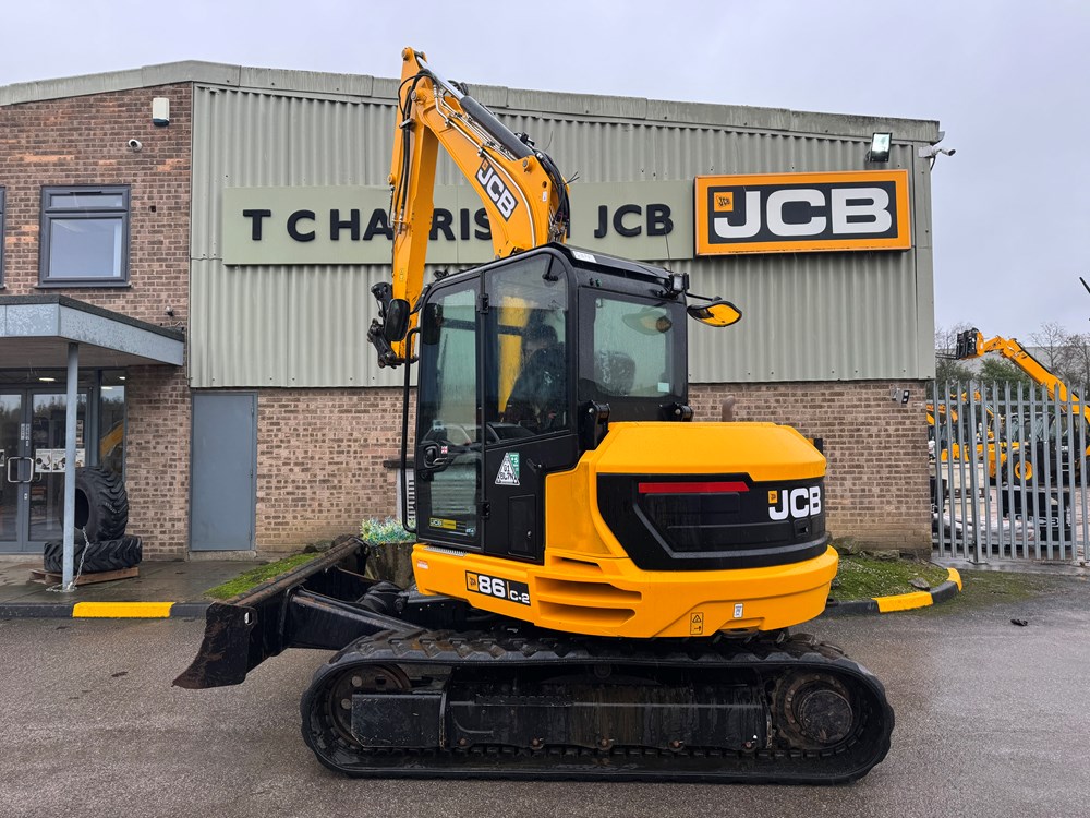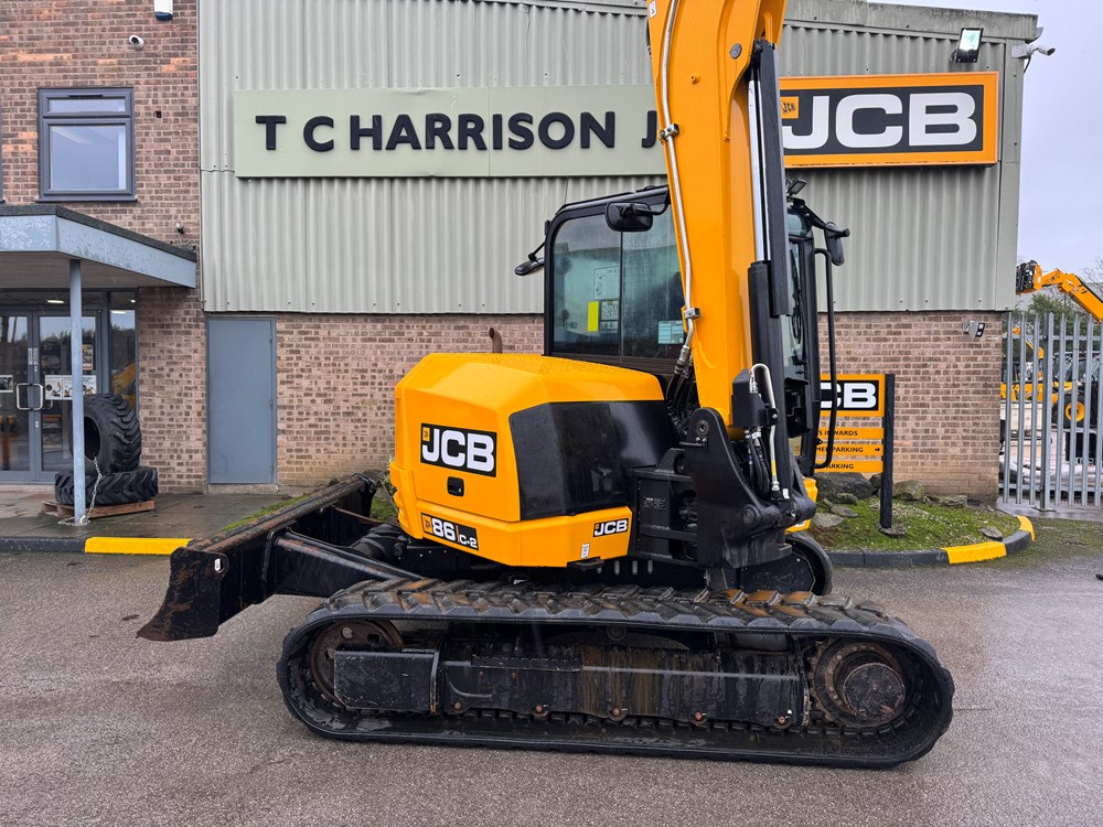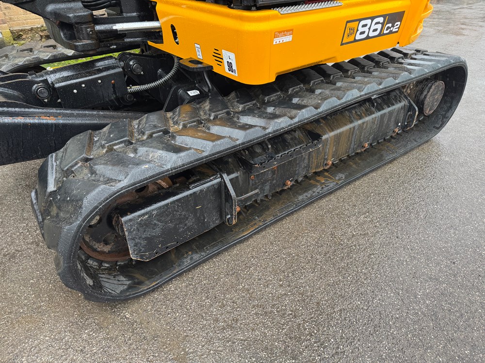 JCB 86C-2 MIDI EXCAVATOR - CAB WITH AIR CONDITIONING, RUBBER TRACKS, ISO CONTROL PATTERN: HIGH FLOW, DOUBLE ACTING AUX, HIGH BACK FABRIC SUSPENSION SEAT, 2250MM DIPPER, DOZER BLADE, HYDRAULIC QUICK HITCH, DOZER, BOOM AND DIPPER HBCV'S, MANUFACTURERS WARRANTY UNTIL 19.06.2026 OR 2000 HOURS, 500 HOUR SERVICE COMPLETED AT 559 HOURS - LOCATION: TCH JCB ALFRETON