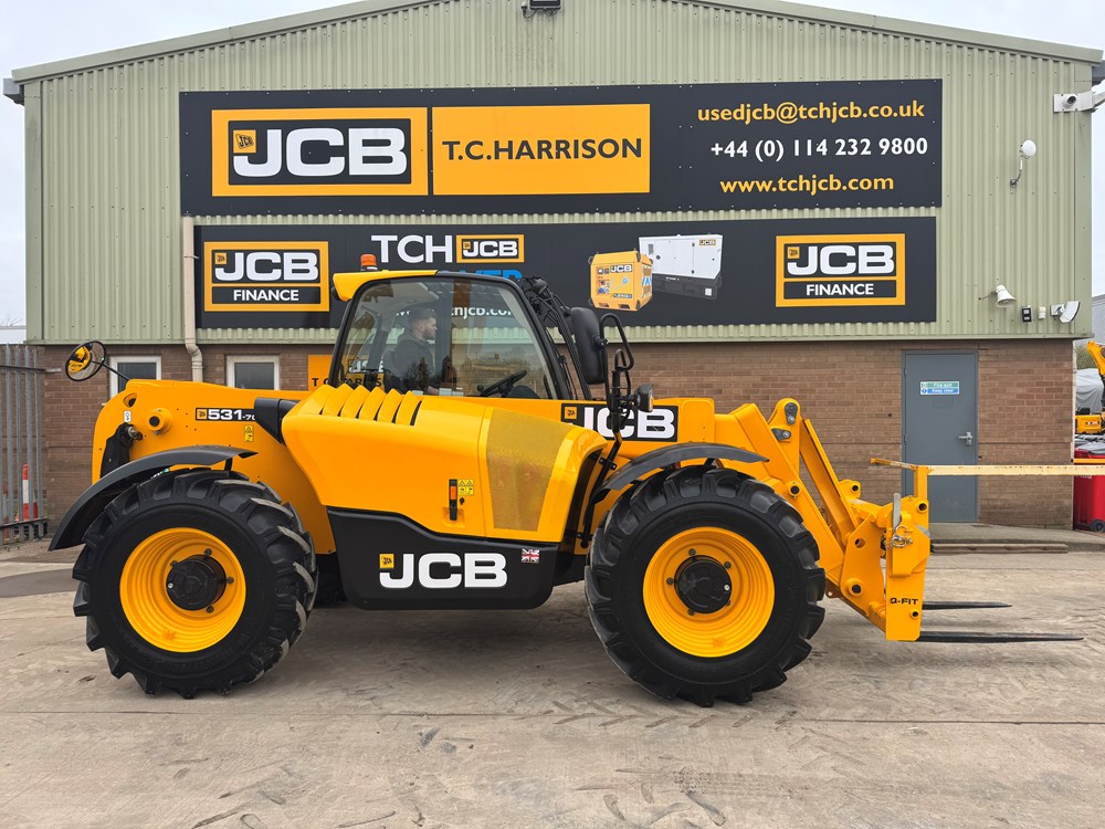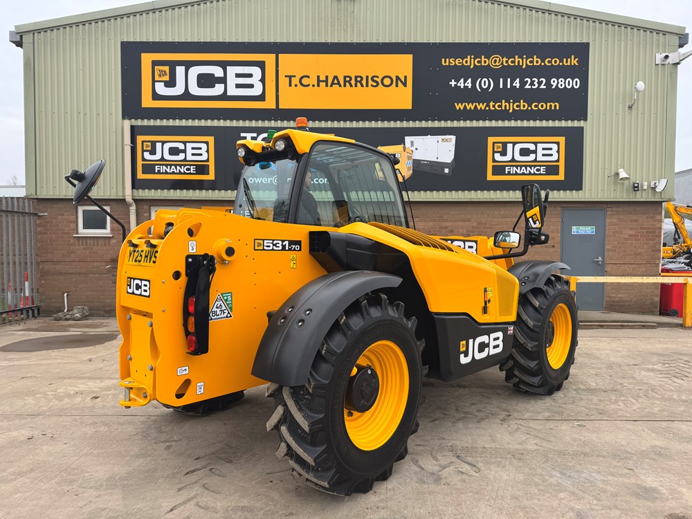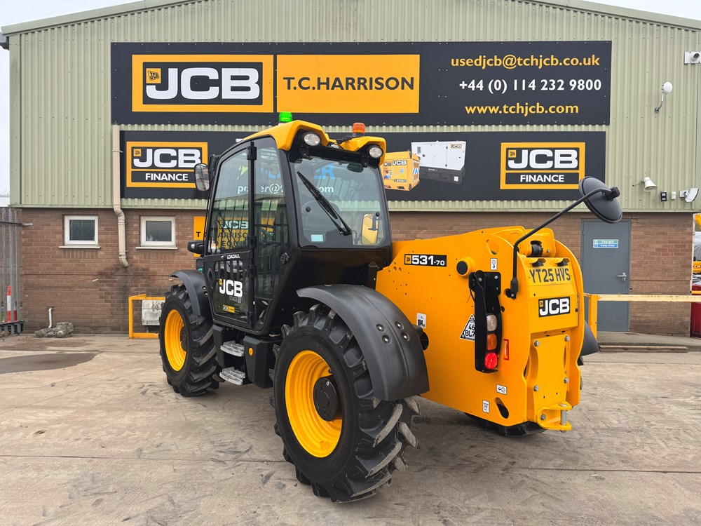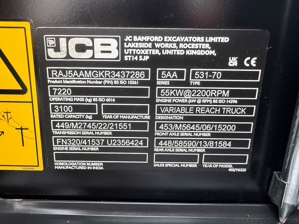 JCB 531-70 LOADALL - 55KW (74HP) STAGE 5 ENGINE, FABRIC SUSPENSION SEAT WITH ADJUSTABLE BACKREST, CAB INC HEATER, 2 LEVER 1 AUX TILT LEVER LOCK, TRANSMISSION BELLY PLATE KIT, Q-FIT CARRIAGE, ROOF AND FRONT SCREEN GUARDS, 1T MECH TOW HITCH, PALLET FORKS, MANUFACTURERS WARRANTY UNTIL 29.06.26 - LOCATION: TCH JCB LINCOLN