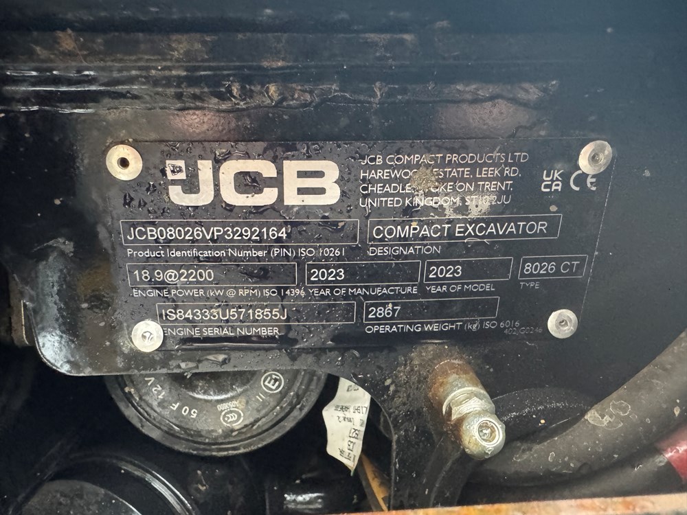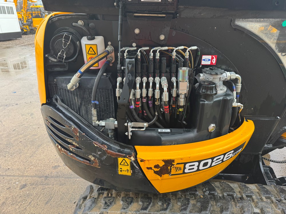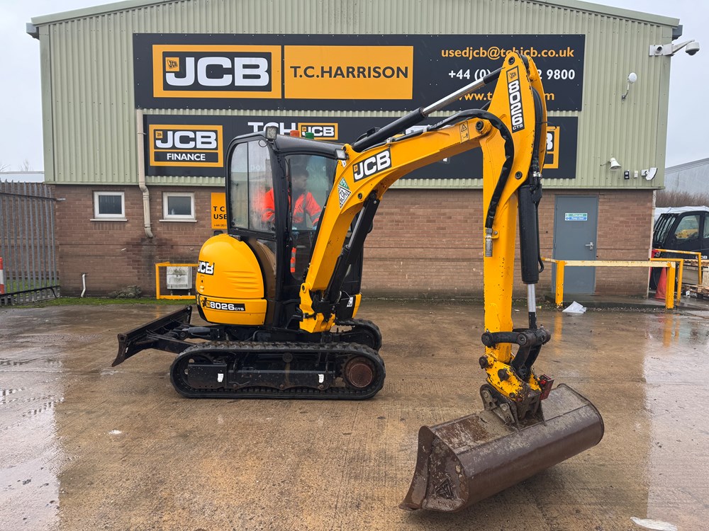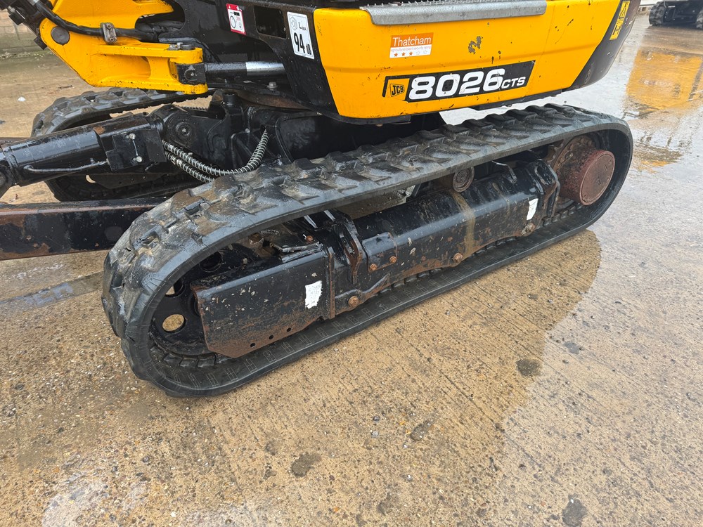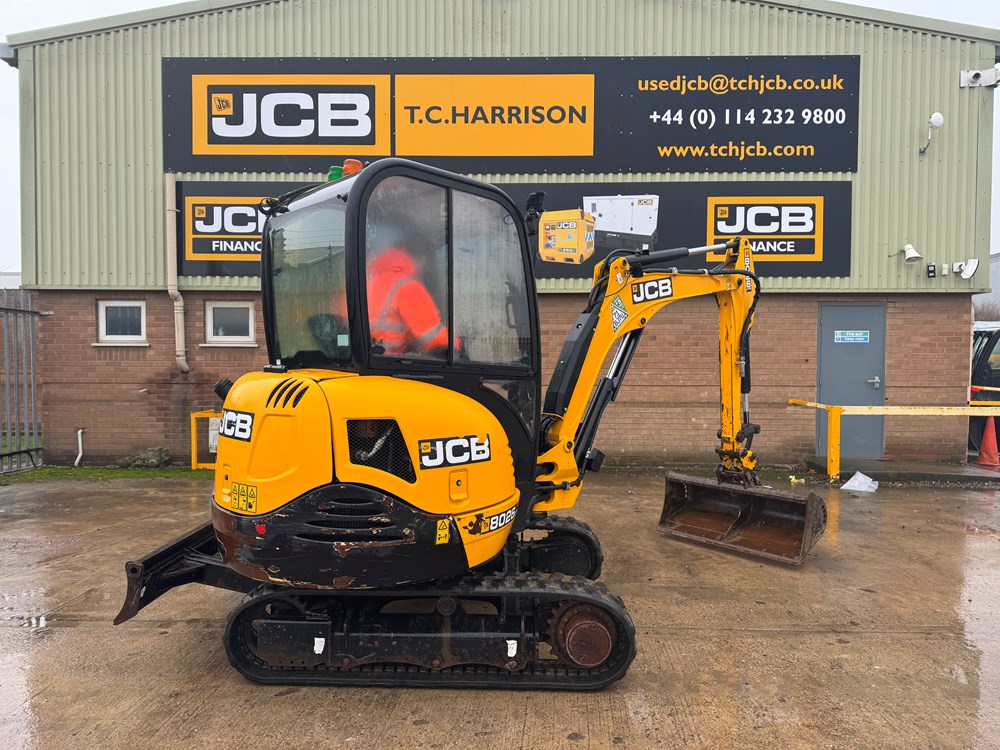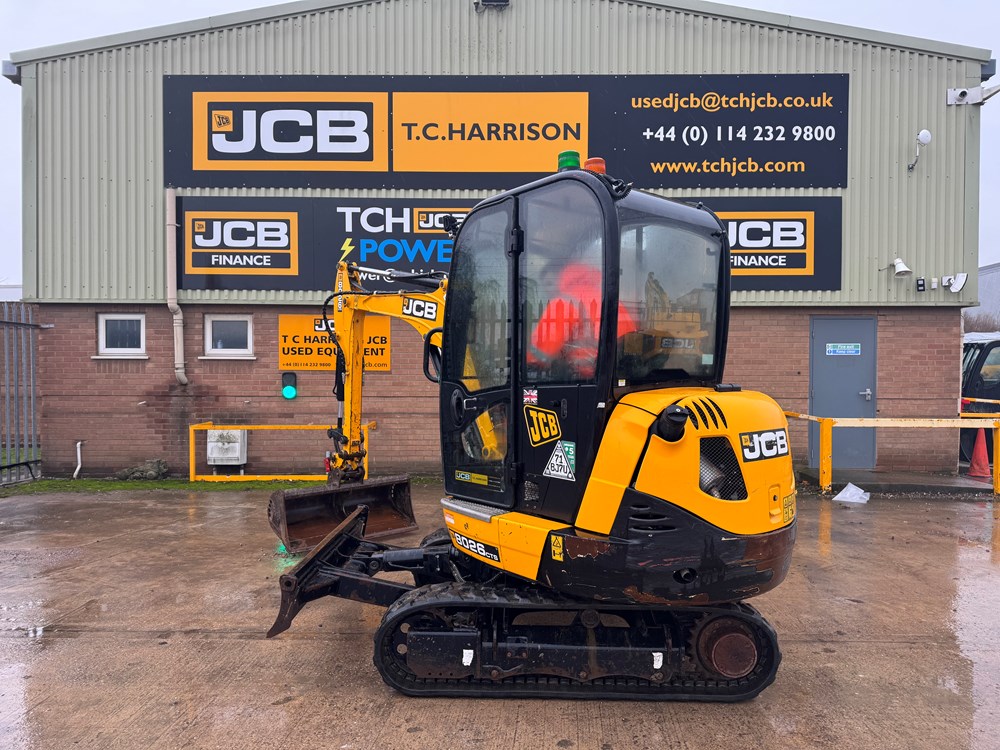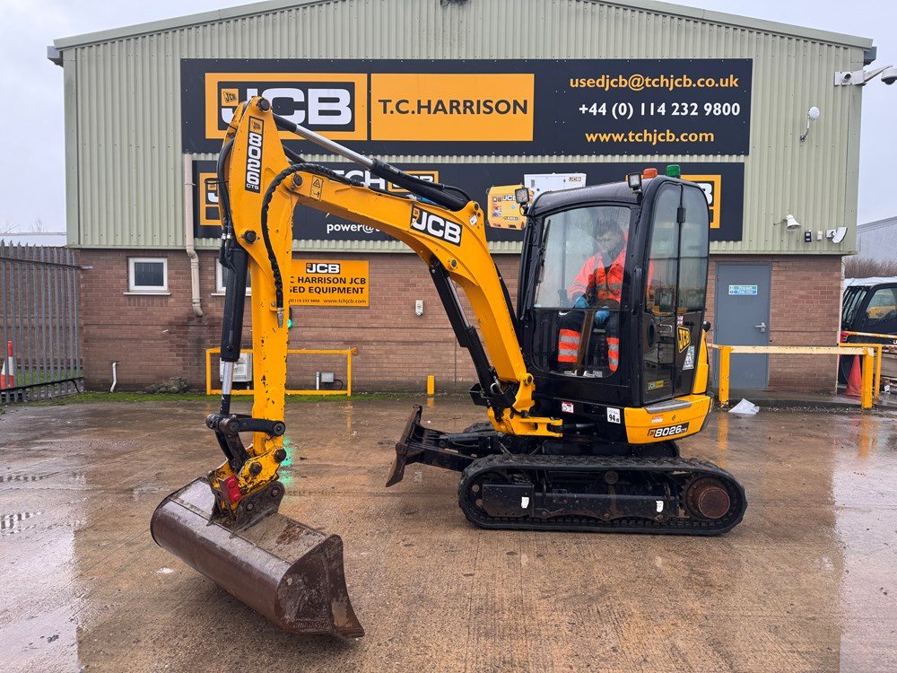 JCB 8026 MINI EXCAVATOR - CAB WITH HEATER, RUBBER TRACKS, ISO SERVO CONTROLS, 1 X MECHANICAL PROPORTIONAL FOOT CONTROL AUXILIARY, FABRIC SUSPENSION SEAT, 1300MM DIPPER, MAXI-LIFT LONG DOZER BLADE, SINGLE/DOUBLE ACTING AUXILIARY CIRCUIT WITH CHANGE OVER VALVE, FULL RADIO KIT, LIGHT WEIGHT PACKAGE, MECHANICAL QUICK HITCH, 1 X USED BUCKET - LOCATION: TCH JCB LINCOLN
