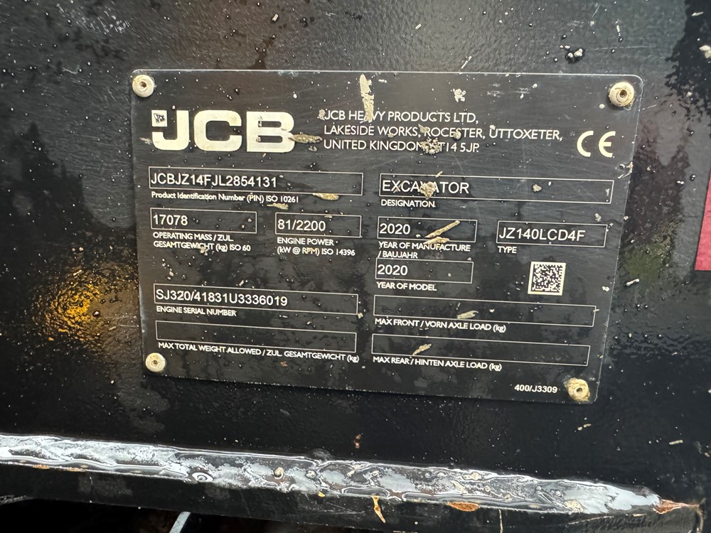JCB JZ140LC TRACKED EXCAVATOR - T4F ENGINE, 700MM TRIPLE GROUSER PADS WITH BOLT ON RUBBER PADS, DOZER BLADE, MONOBOOM, 3 HBCV, 3.0M DIPPER, HAMMER/AUX PIPEWORK, HYDRAULIC QUICK HITCH - LOCATION: TCH JCB ALFRETON