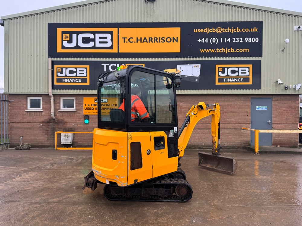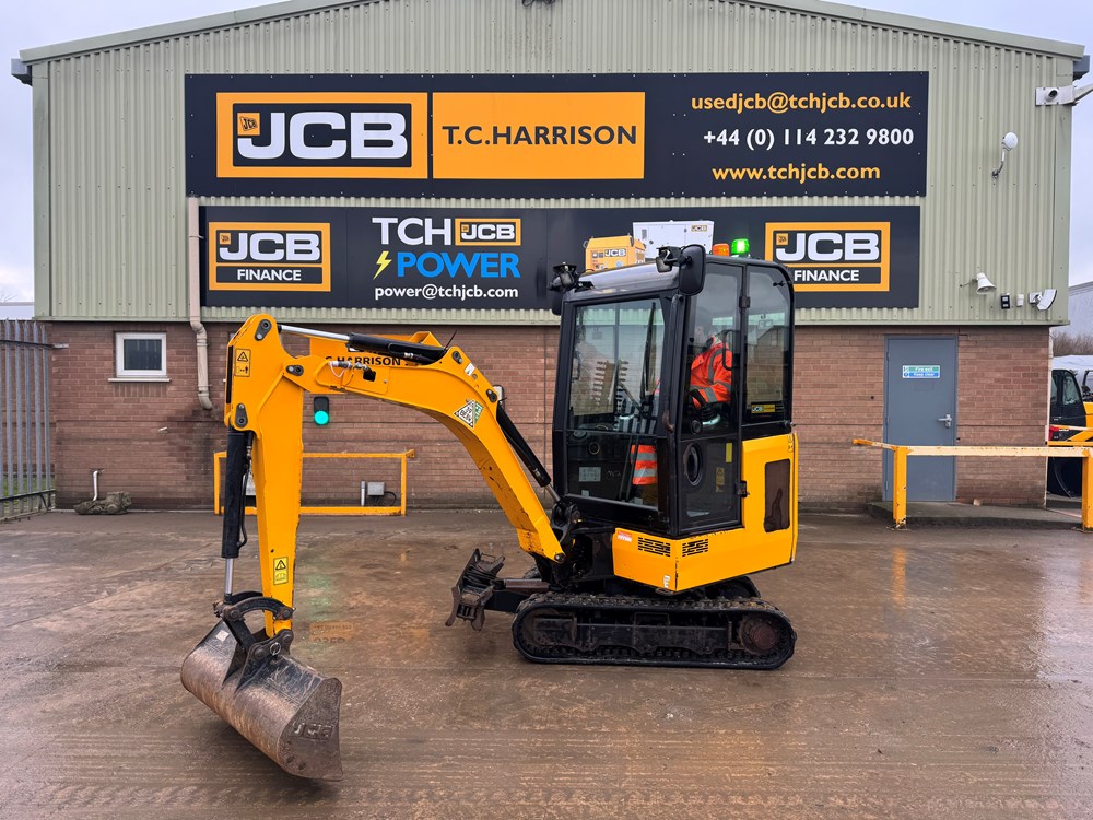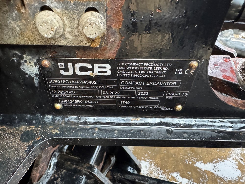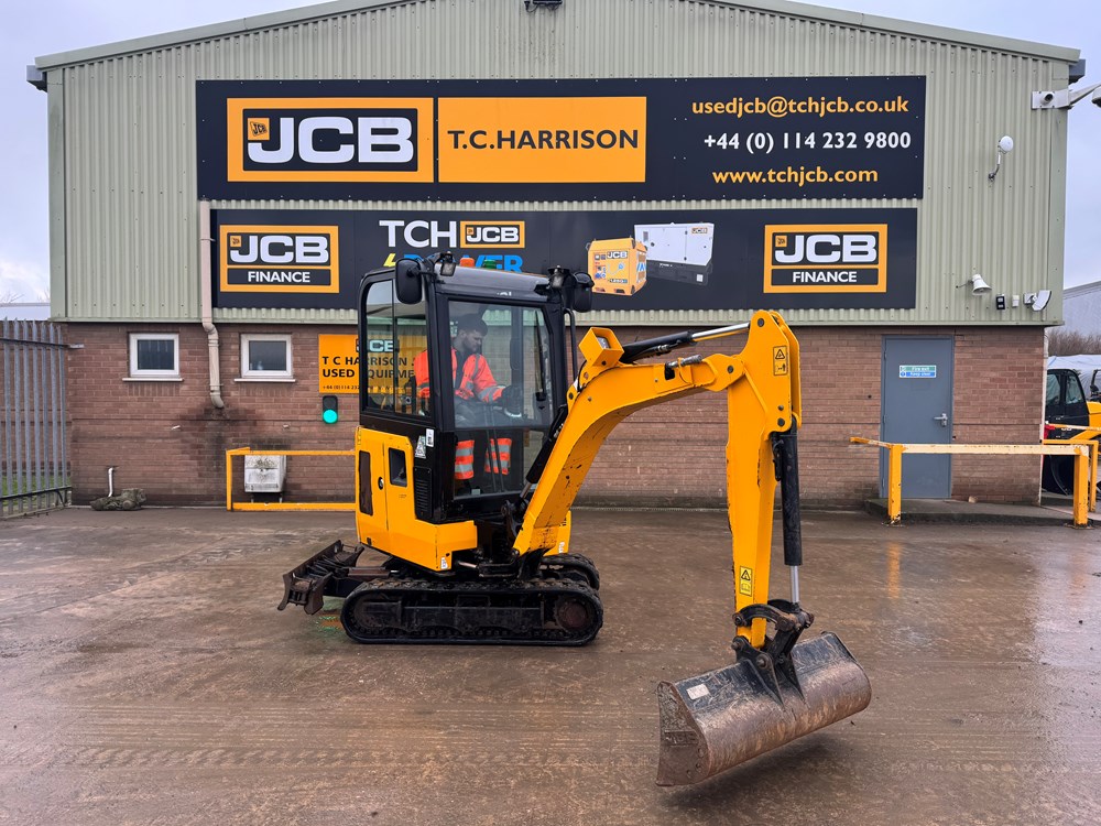 JCB 16C-1 MINI EXCAVATOR - CAB WITH HEATER, RUBBER TRACKS, ISO CONTROL PATTERN: HIGH FLOW; DOUBLE ACTING AUX, EXTENDING UNDERCARRIAGE, STATIC FABRIC SEAT, 1100MM DIPPER, STANDARD DOZER WITH SWING OUT EXTENSIONS, AUTO KICK DOWN TRACK MOTORS, 1 X USED BUCKET - LOCATION: TCH JCB LINCOLN