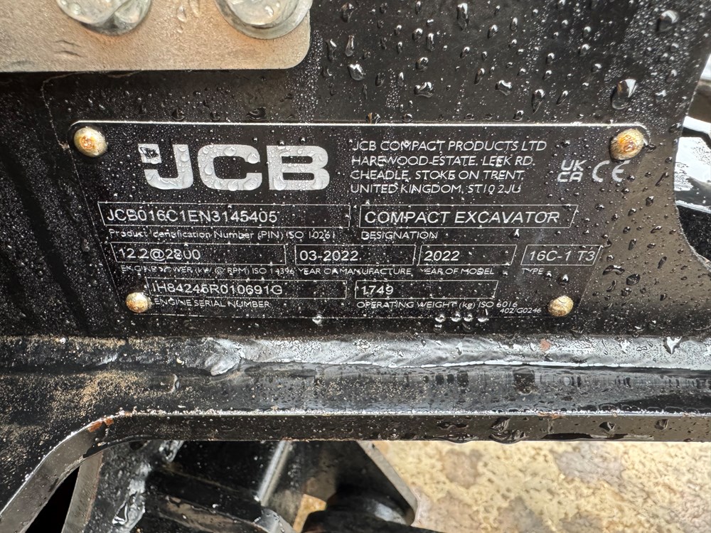 *** CONSIGNED TO TCH JCB AUCTION, START PRICE £11,000 - VISIT www.tchjcbauction.com NOW FOR MORE INFORMATION, TO REGISTER & BID, AUCTION ENDS MONDAY 23RD MARCH 2026, NO BUYERS FEES, WHAT YOU BID IS WHAT YOU PAY, NO DEPOSIT REQUIRED, THE START PRICE IS THE RESERVE PRICE *** JCB 16C-1 MINI EXCAVATOR - CAB WITH HEATER, RUBBER TRACKS, ISO CONTROL PATTERN: HIGH FLOW; DOUBLE ACTING AUX, EXTENDING UNDERCARRIAGE, STATIC FABRIC SEAT, 1100MM DIPPER, STANDARD DOZER WITH SWING OUT EXTENSIONS, AUTO KICK DOWN TRACK MOTORS, MECHANICAL QUICK HITCH, 3 X USED BUCKETS - LOCATION: TCH JCB LINCOLN